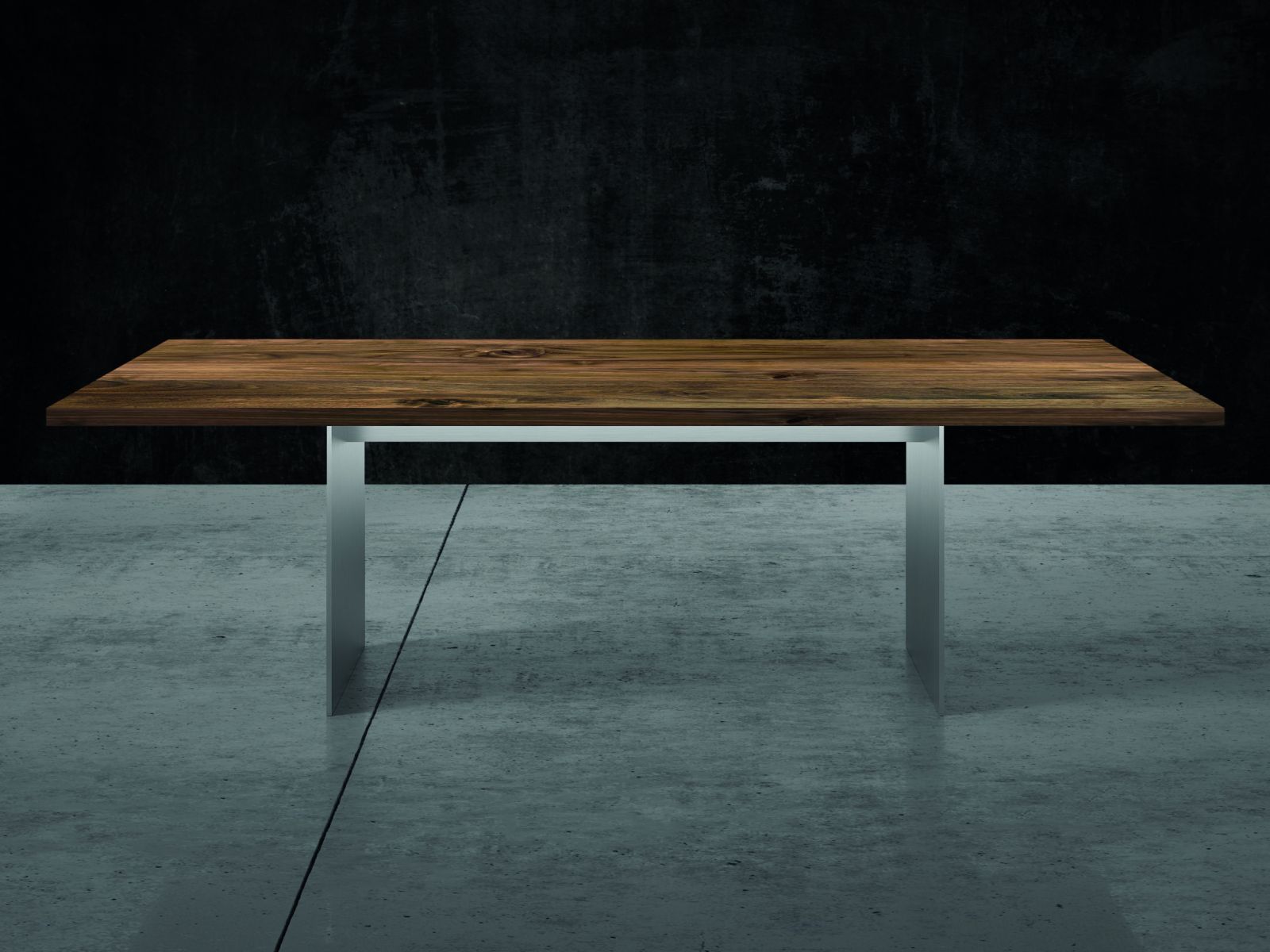 Highlight dieses Tisches ist ohne Frage das stilhafte Wangengestell aus echtem Rohstahl mit Arbeitsspuren. Auf der Tischoberfläche werden alle Vertiefungen mit Aluminium-Inletts oder auf Wunsch mit Pigmentfüllung gefüllt. Je nachdem in welcher Grösse der Tisch für Sie angefertigt wird, passen bis zu 10 Personen an den Tisch, da dieser bis auf eine Länge von 350 cm erweiterbar ist!