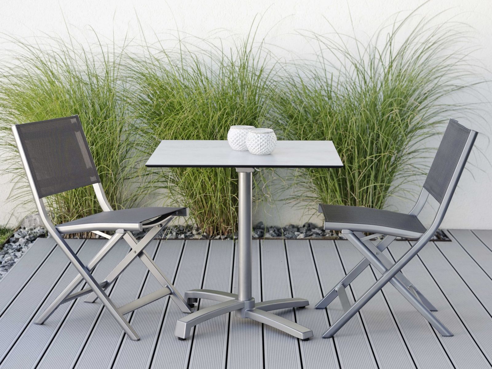 Der Bistrotisch Livo ist eine platzsparende Lösung für den Aussenbereich. So lassen sich mehrere Tische (abgeklappt) ineinander stapeln.