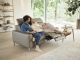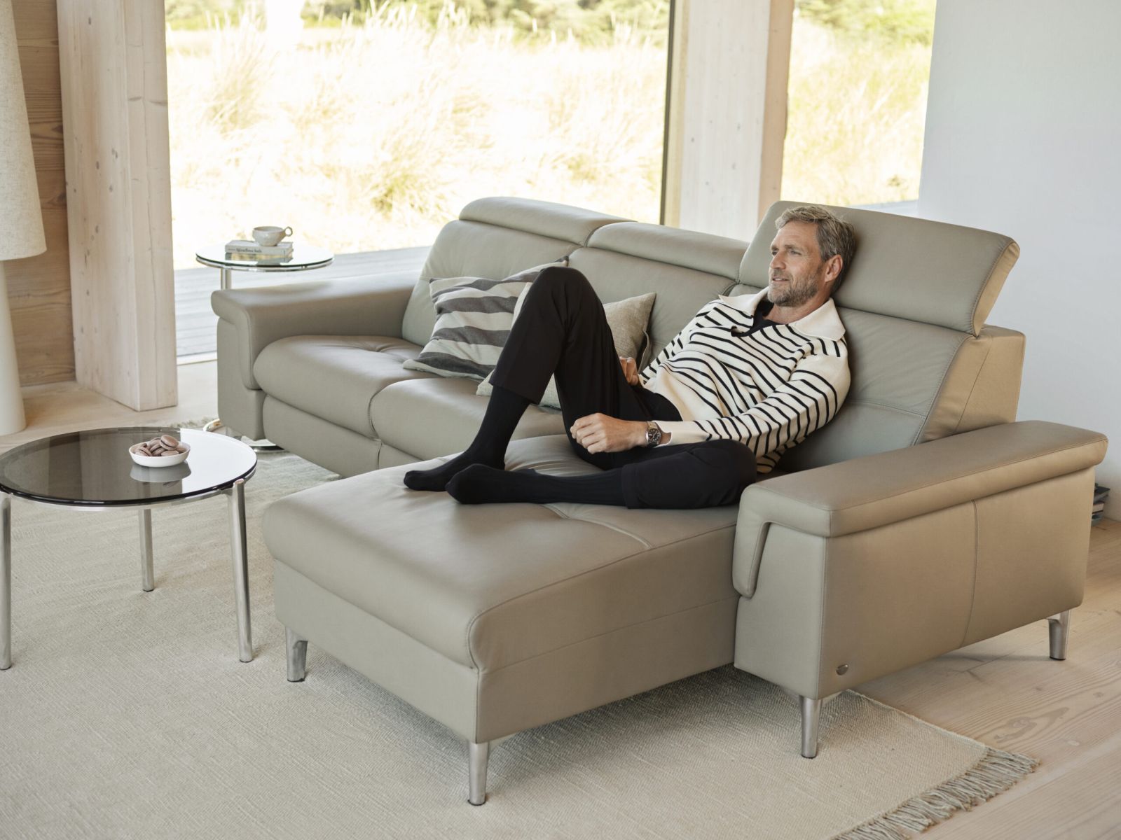 Mit eingeklappter Kopfstütze wirkt das Sofa optisch kleiner. In ausgeklappter Stellung bietet sie eine gute Unterstützung des Kopfes und verwandelt ein Sofa mit niedriger Rückenlehne in ein Sofa mit hoher Rückenlehne.