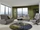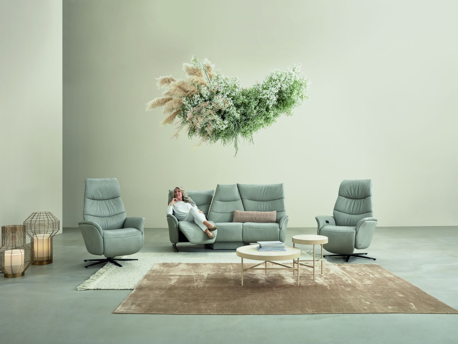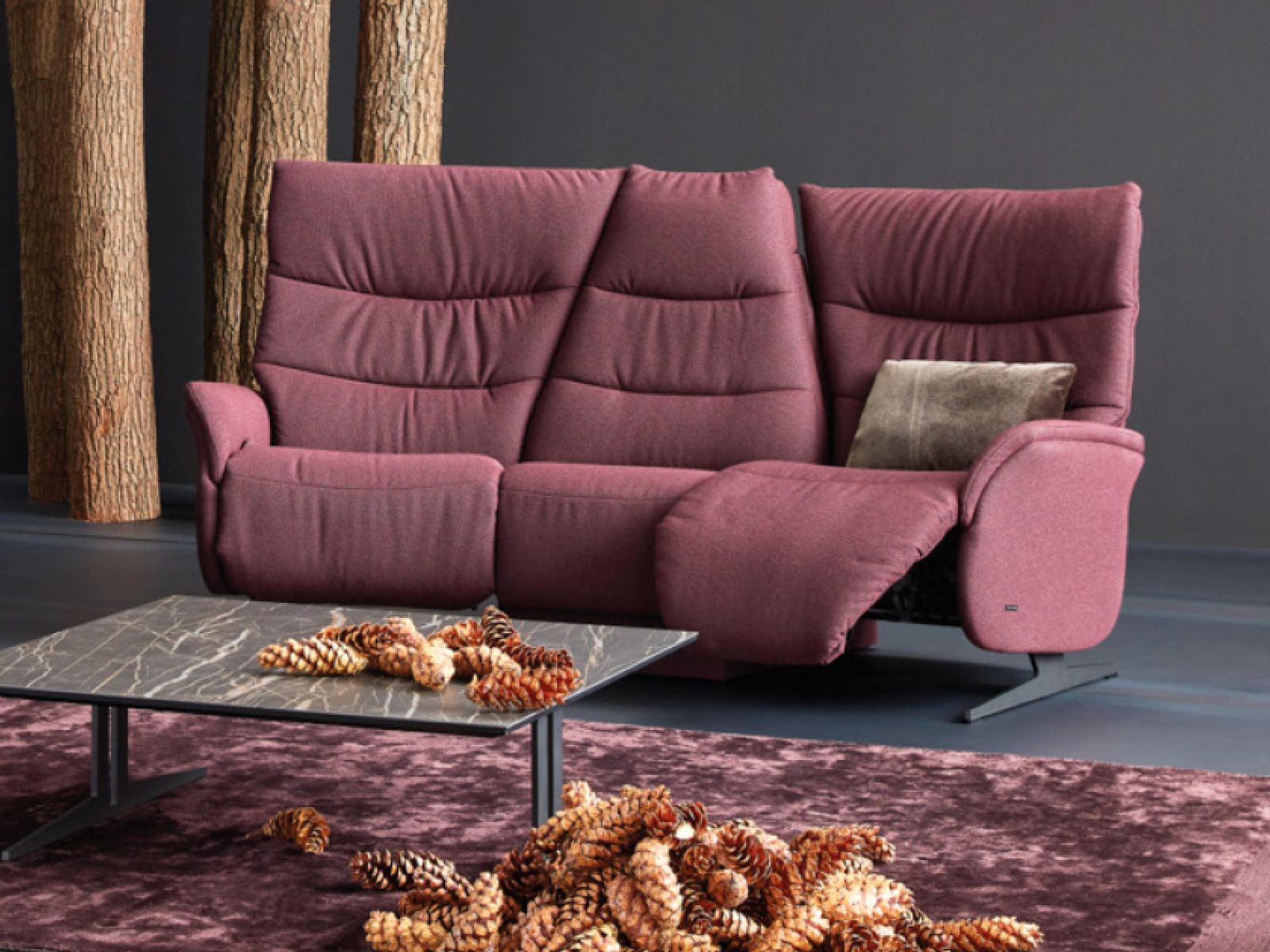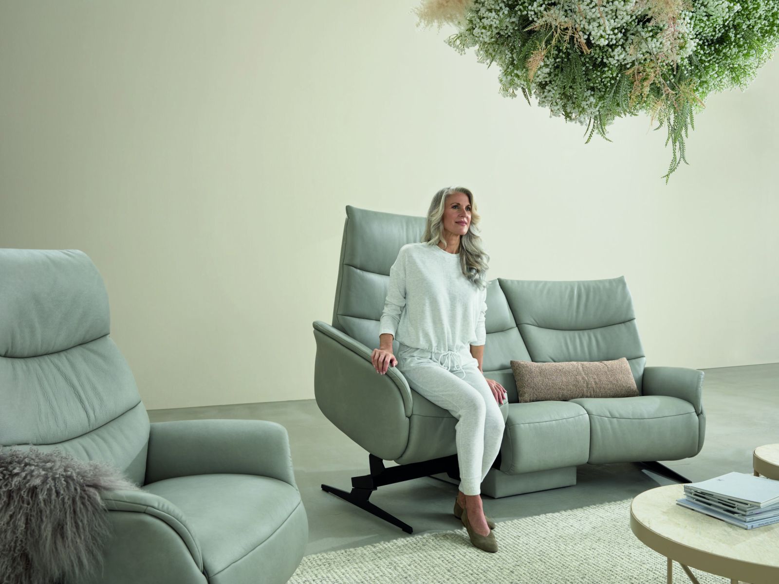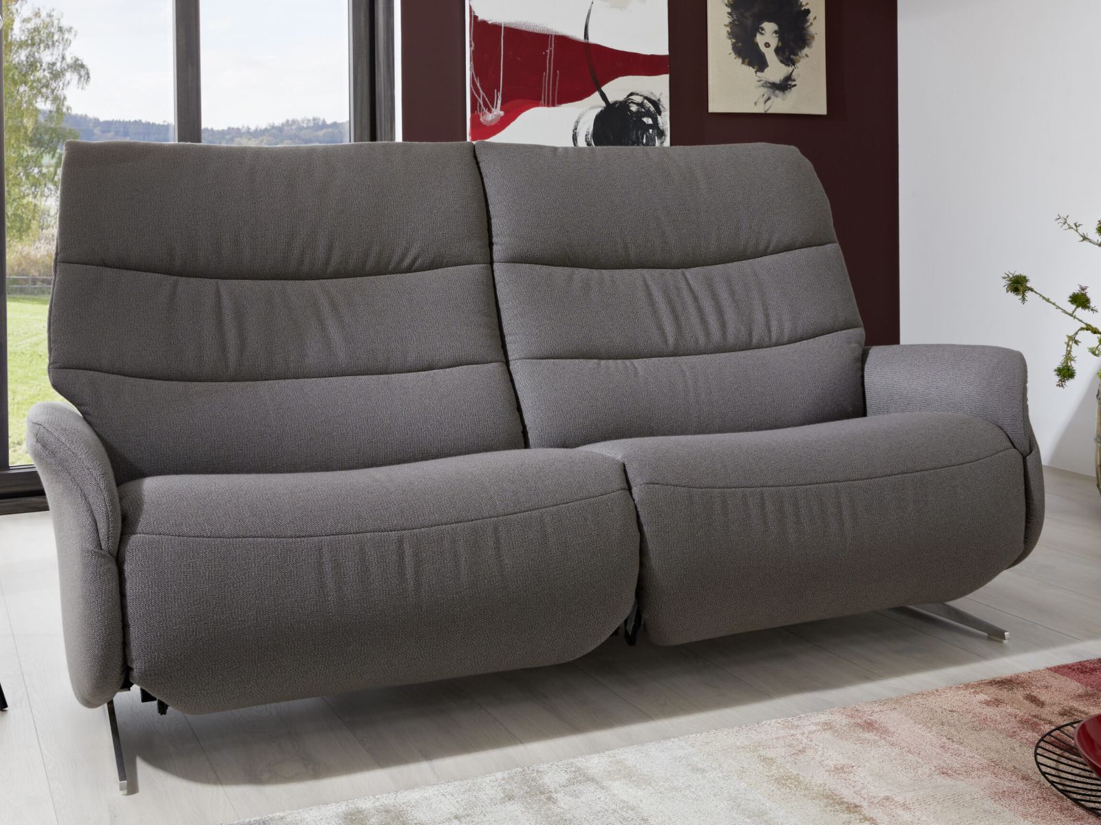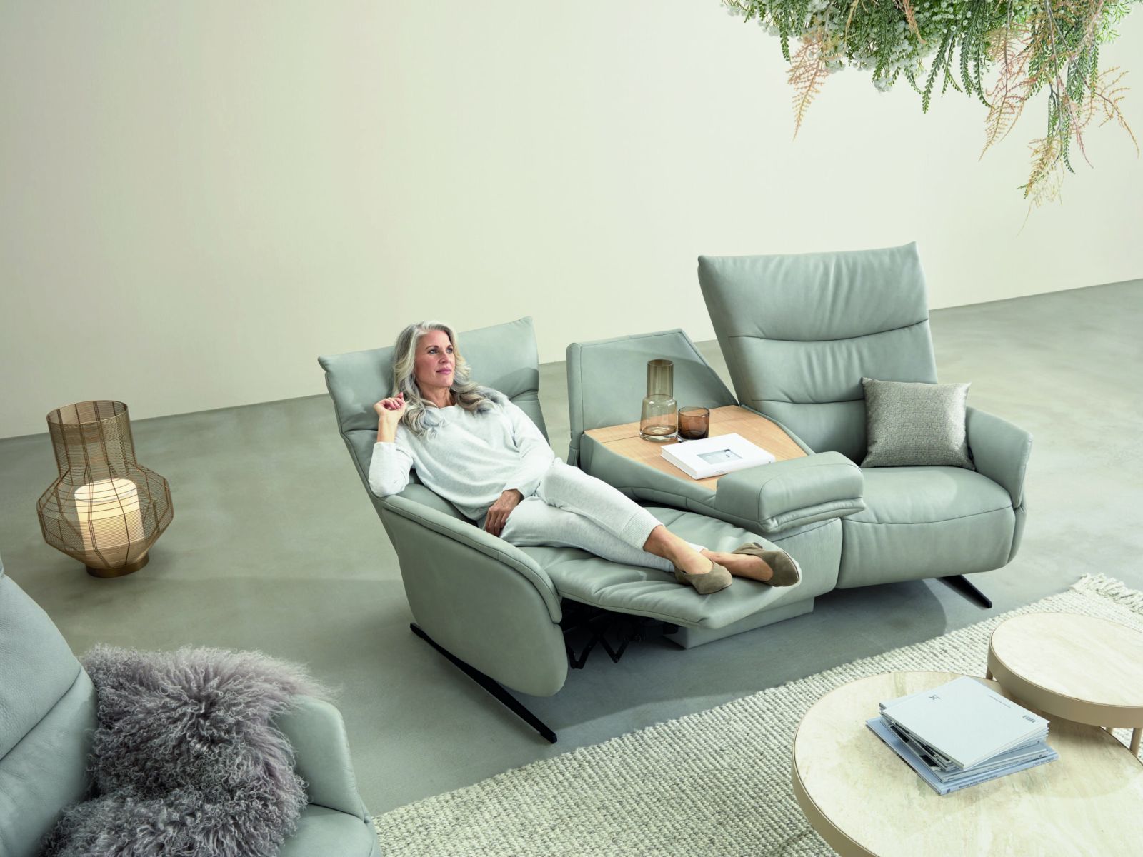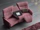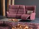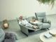 Das Designsofa Sophia lässt sich manuell oder elektrisch durch einen Kippschalter seitlich am Sitz in die Ruheposition bringen.