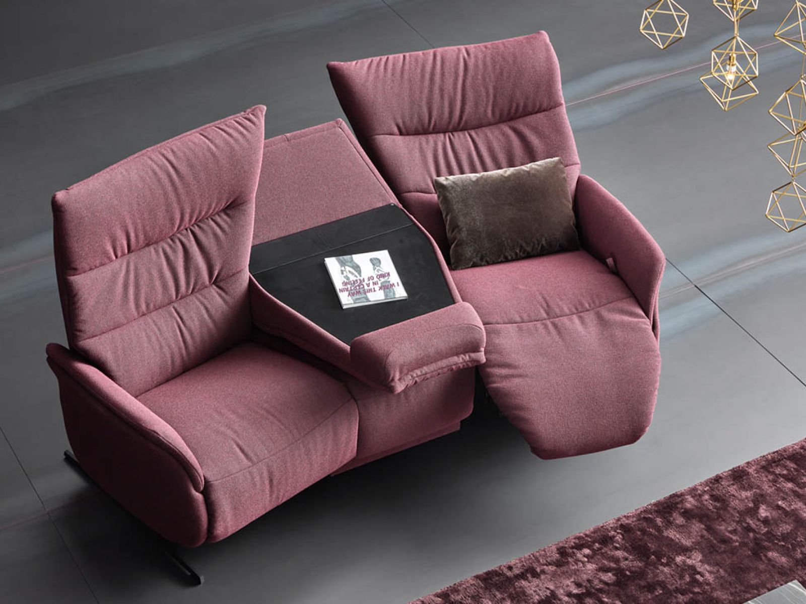 Das trapezförmige Modell verfügt über eine abklappbare zentrale Rückenlehne, die mit wenigen Handgriffen in einen Ablagetisch verwandelt werden kann.