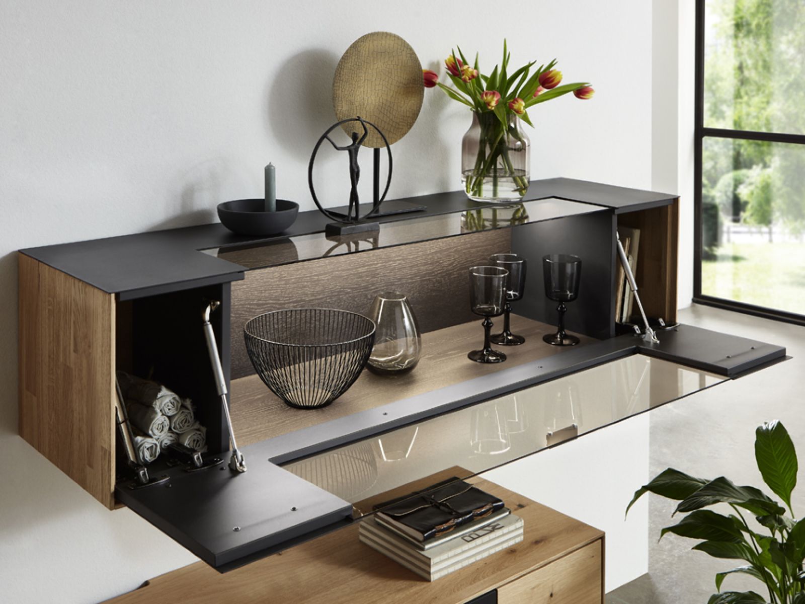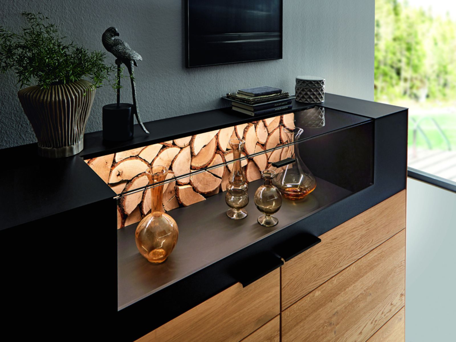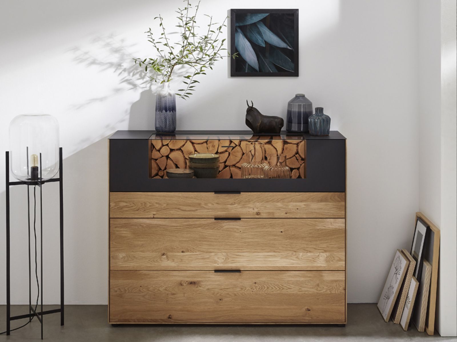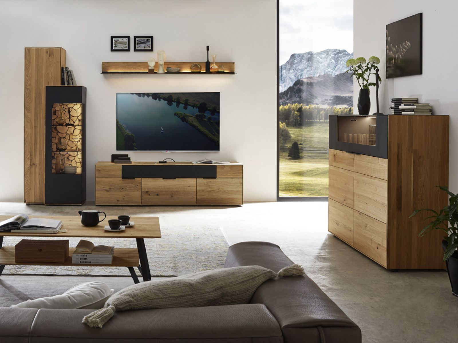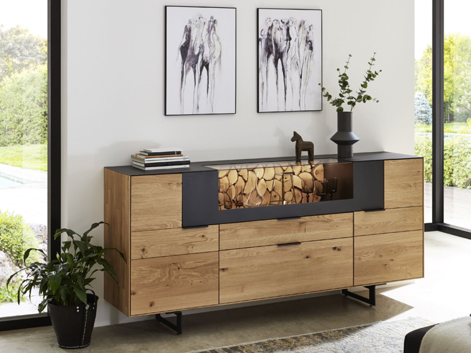 Die Einzelelemente von Marga sind ist aus hochwertigem Eiche-Massivholz gefertigt und überzeugen besonders durch ihren Kaminholz-Akzent.