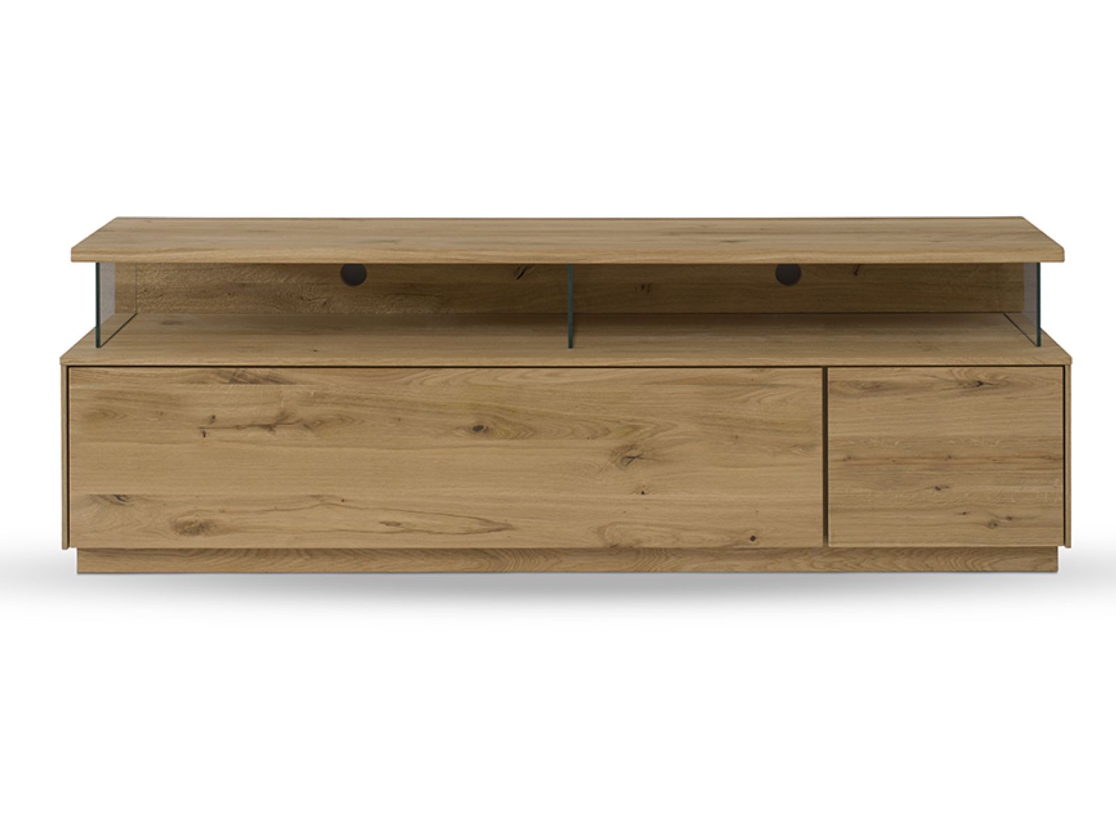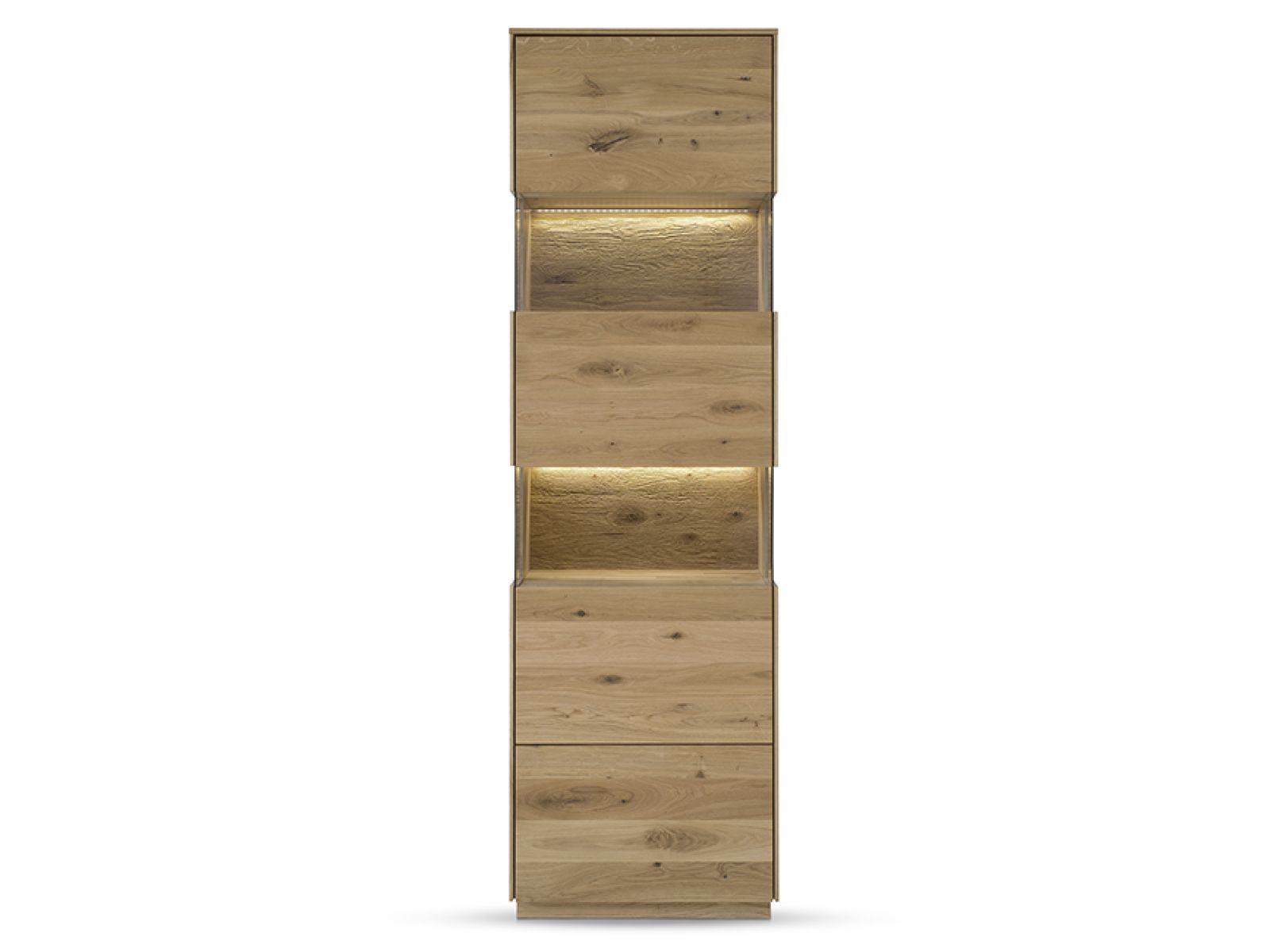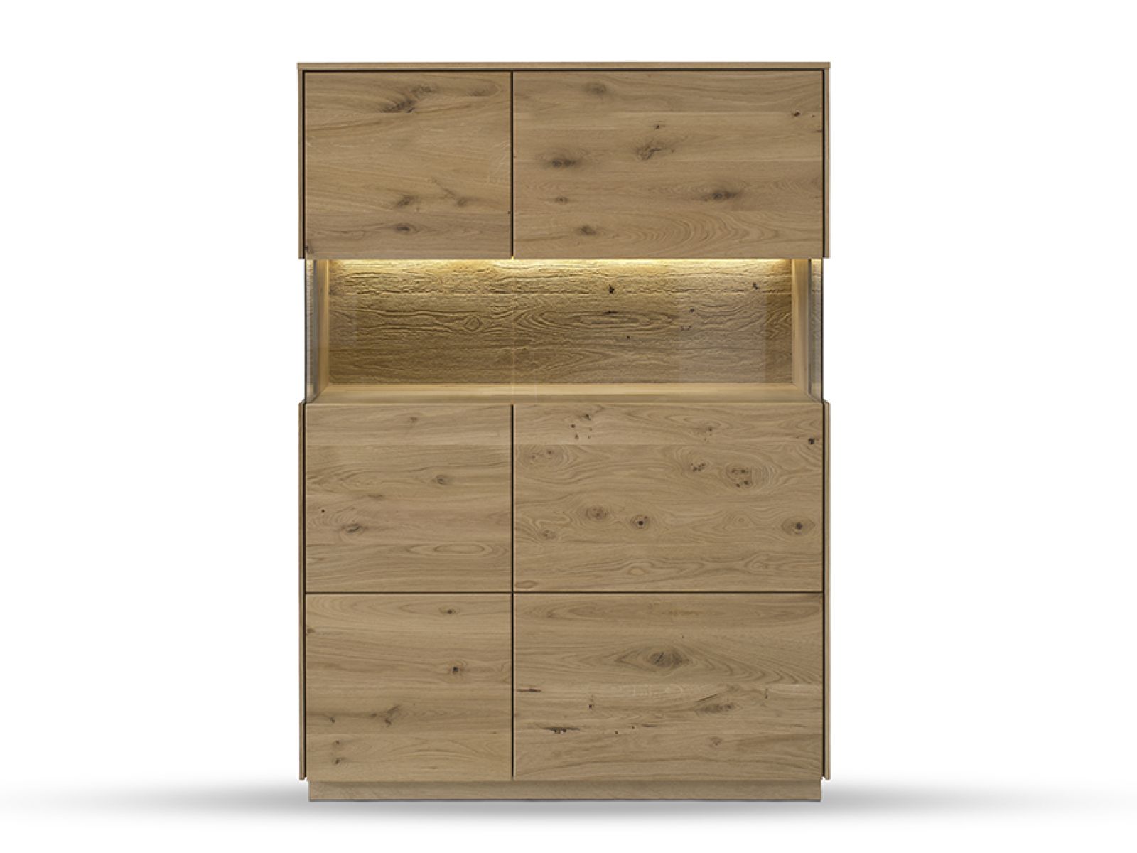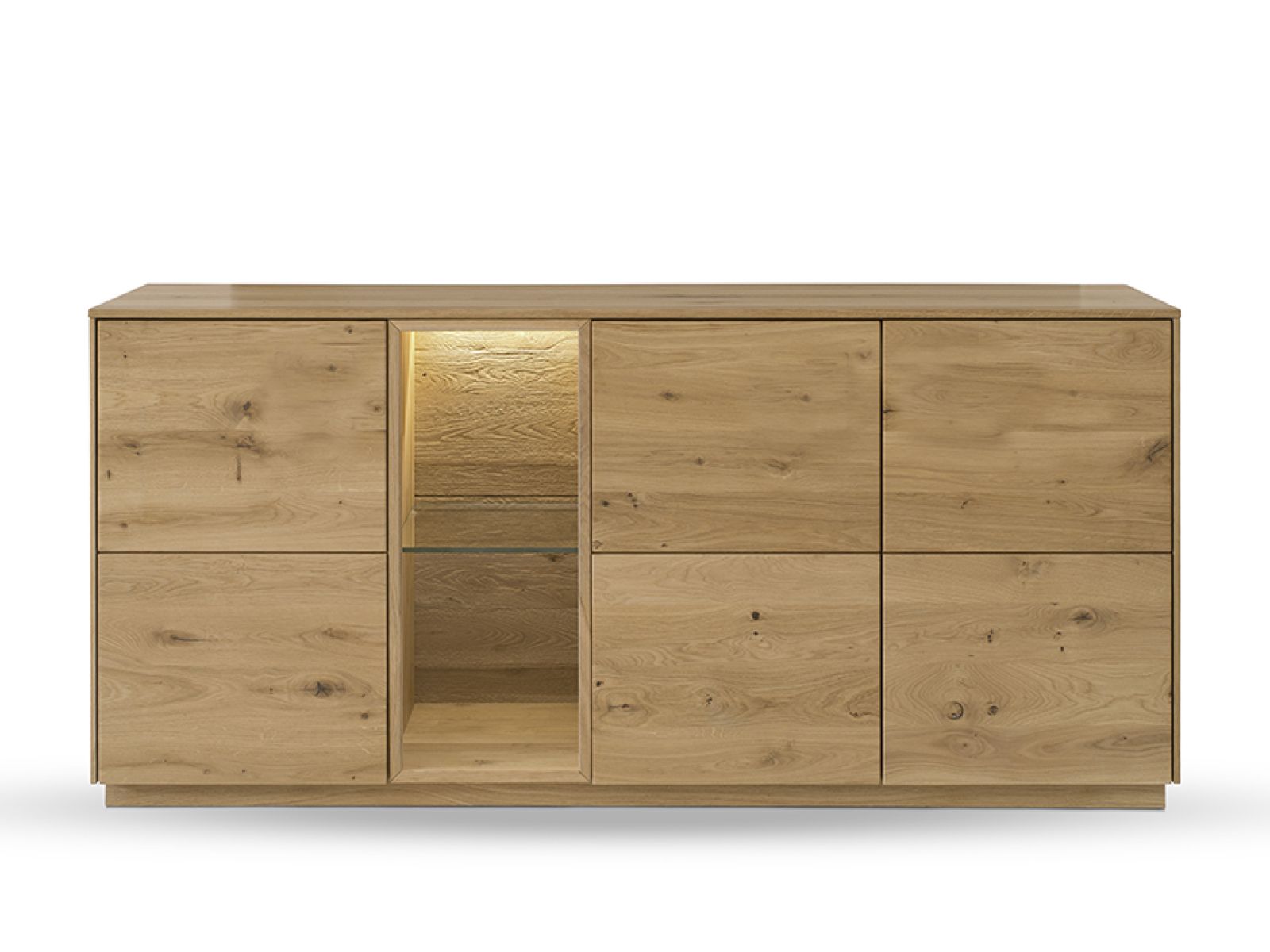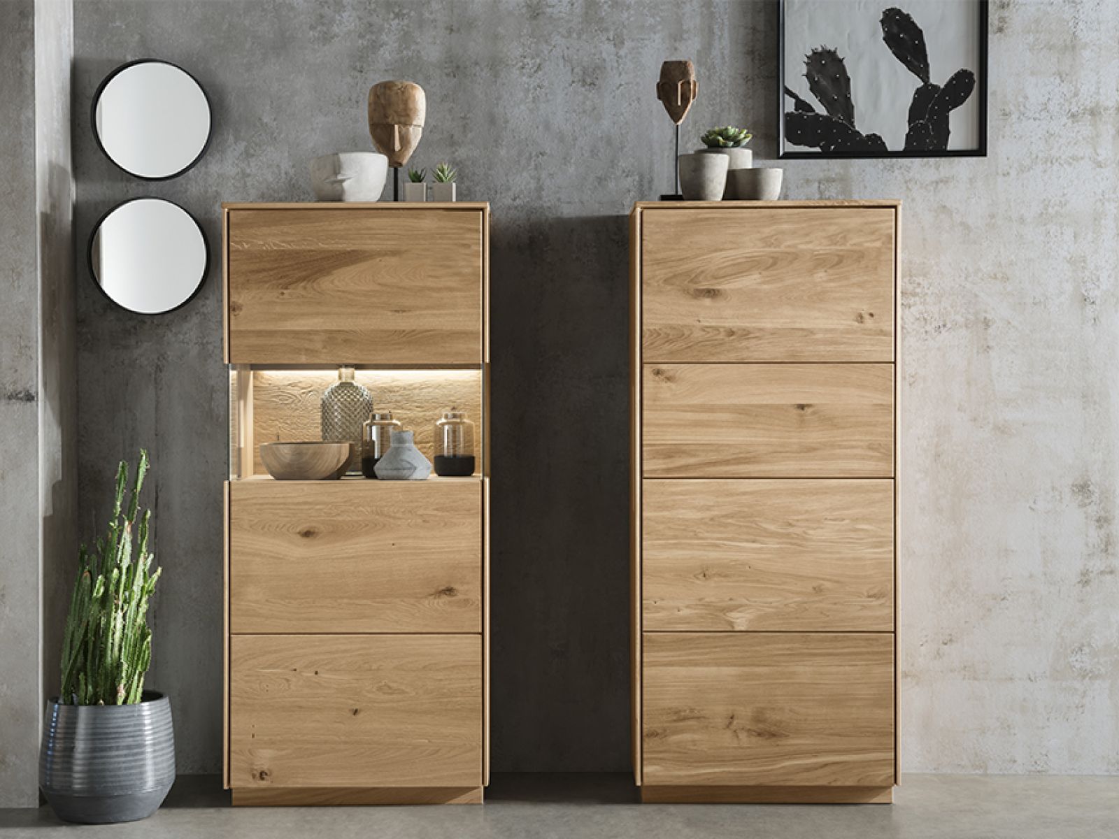 Dieses Wohnprogramm ist zeitlos gestaltet und ergänzt sich hervorragend mit einem rustikal eingerichteten Zuhause und modernem Design. Die elegant verarbeitete Oberfläche in Kombination mit beleuchteten Rückwänden sorgt für ein gemütliches Ambiente.